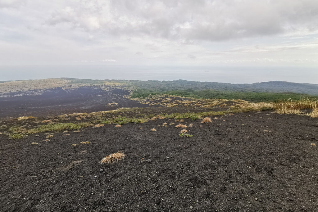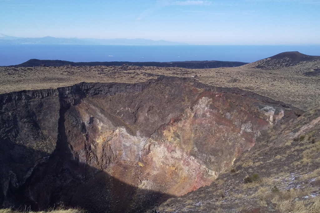 骑完御神火Skyline后,便抵达三原山的山顶入口。在这里,行程将从骑行切换为徒步探索。建议提前准备舒适的步行鞋,或穿着适合步行的SPD骑行鞋。从山顶入口出发,沿着铺设完善的步道步行约45分钟,即可抵达火口附近。沿途可见1986年大规模喷发后流淌凝固的熔岩,构成一片粗犷却壮丽的火山景观。