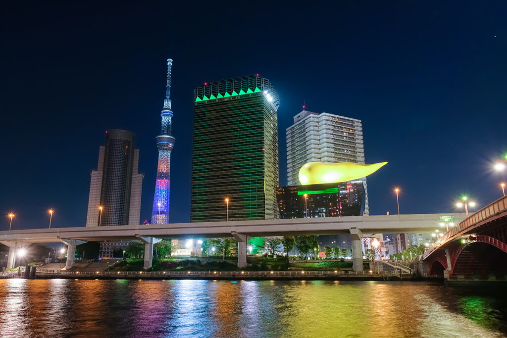 映入眼帘的是东京最具象征意义的景色之一。东京晴空塔的灯光倒映在漆黑的河面上,与朝日集团总部标志性的金色雕塑相互辉映,为夜骑揭开序幕。