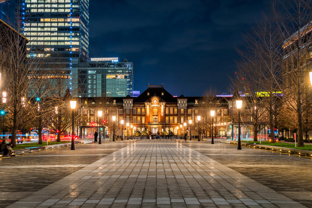 宽阔整齐的石板路在夜晚格外安静。站在道路中央回望,红砖车站在灯光下显得庄严肃穆,两侧是现代高楼林立,构成几乎完美对称的夜景,是东京夜晚最具代表性的画面之一。