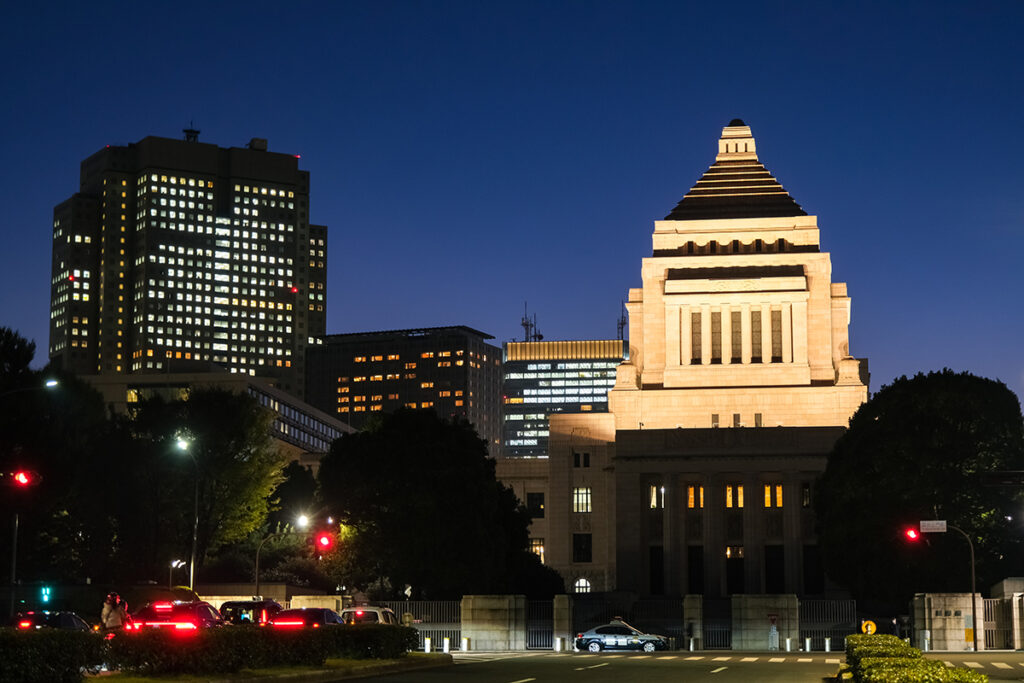 夜晚的议事堂洁白地浮现在灯光中,周围空气庄重而安静。